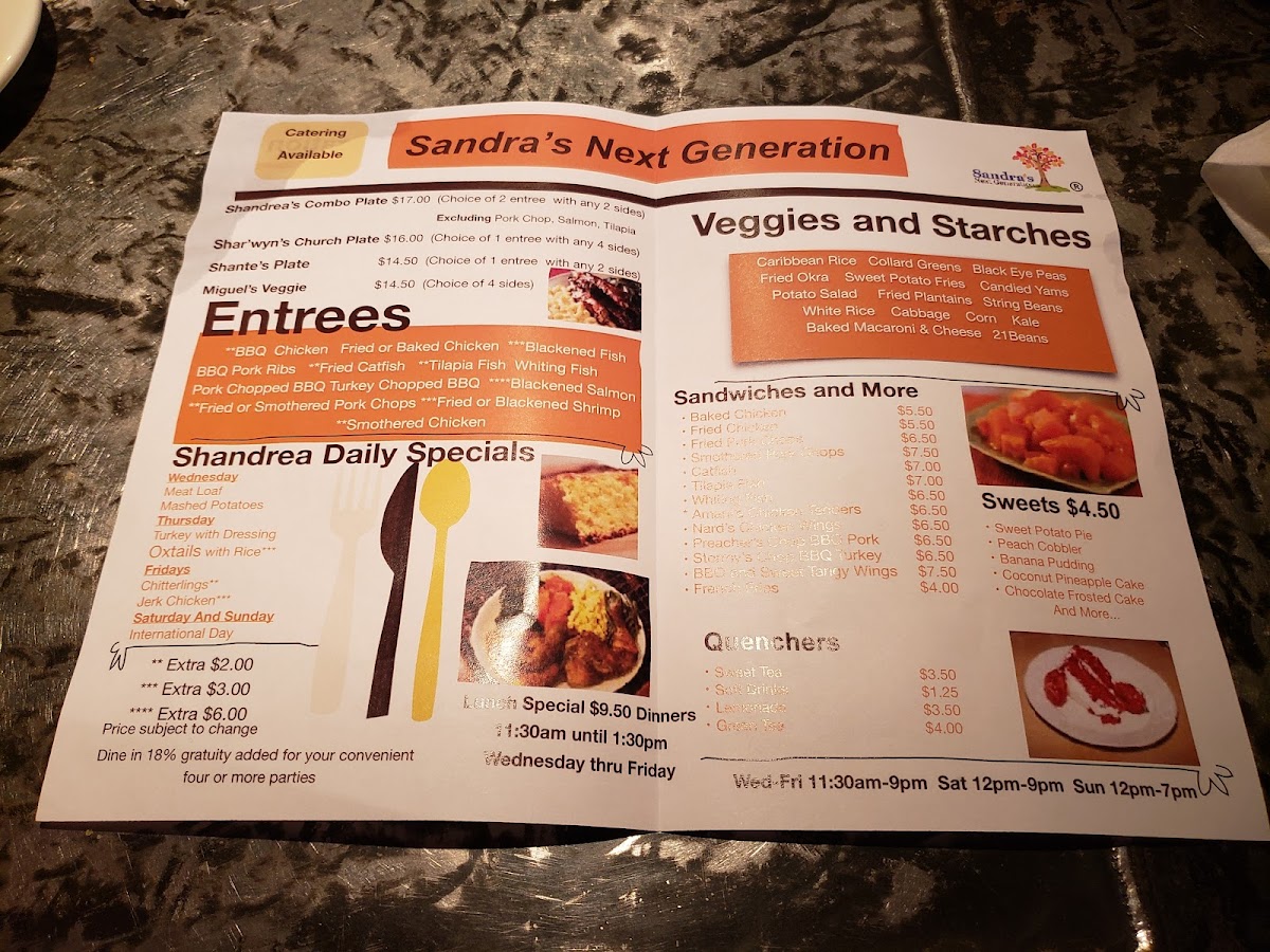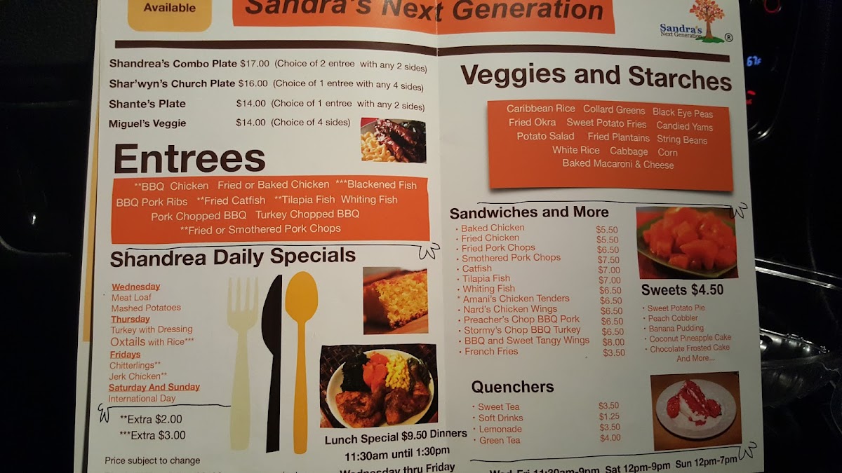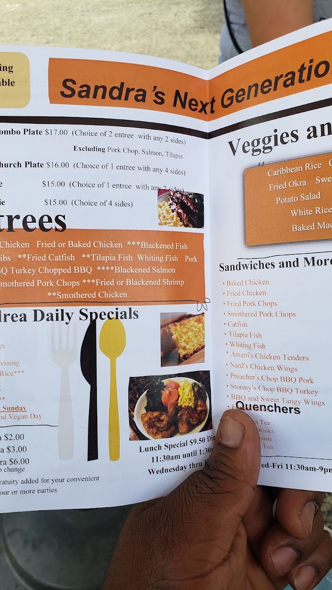 The menu at Sandra's Next Generation offers a variety of traditional soul food dishes with a focus on hearty, comforting meals. Menu items are organized to accommodate both special delivery days and general dining preferences.